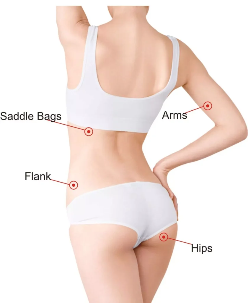 The stomach and hips, thighs, upper back, arms armpits, chin, the saddlebags and calves could be treated safely by Laser-Lipo.